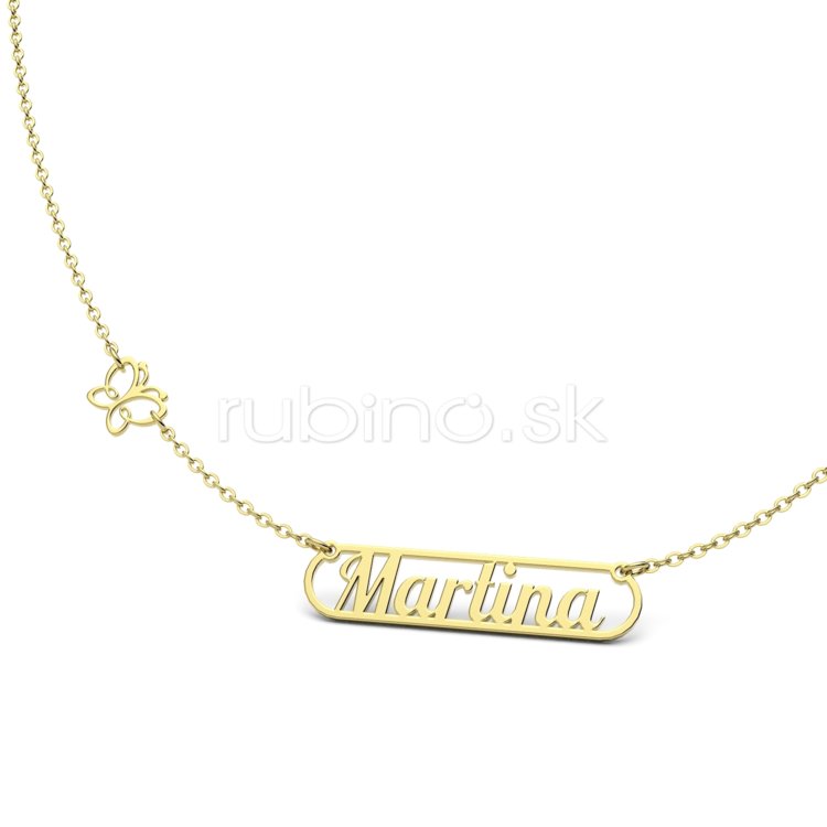Zlatá retiazka s menom MARTINA je vhodným personalizovaným a hodnotným šperkom, ktorý môžete darovať svojim najbližším ku ktorým máte osobný alebo iný vzťah. Do nášho zlatého náhrdelníku sme vložili celkom nový prvok v podobe motýľa, ktorý sa bude vynímať na dekolte Vašej milovanej osoby tak ako na lúke plnej kvetov.